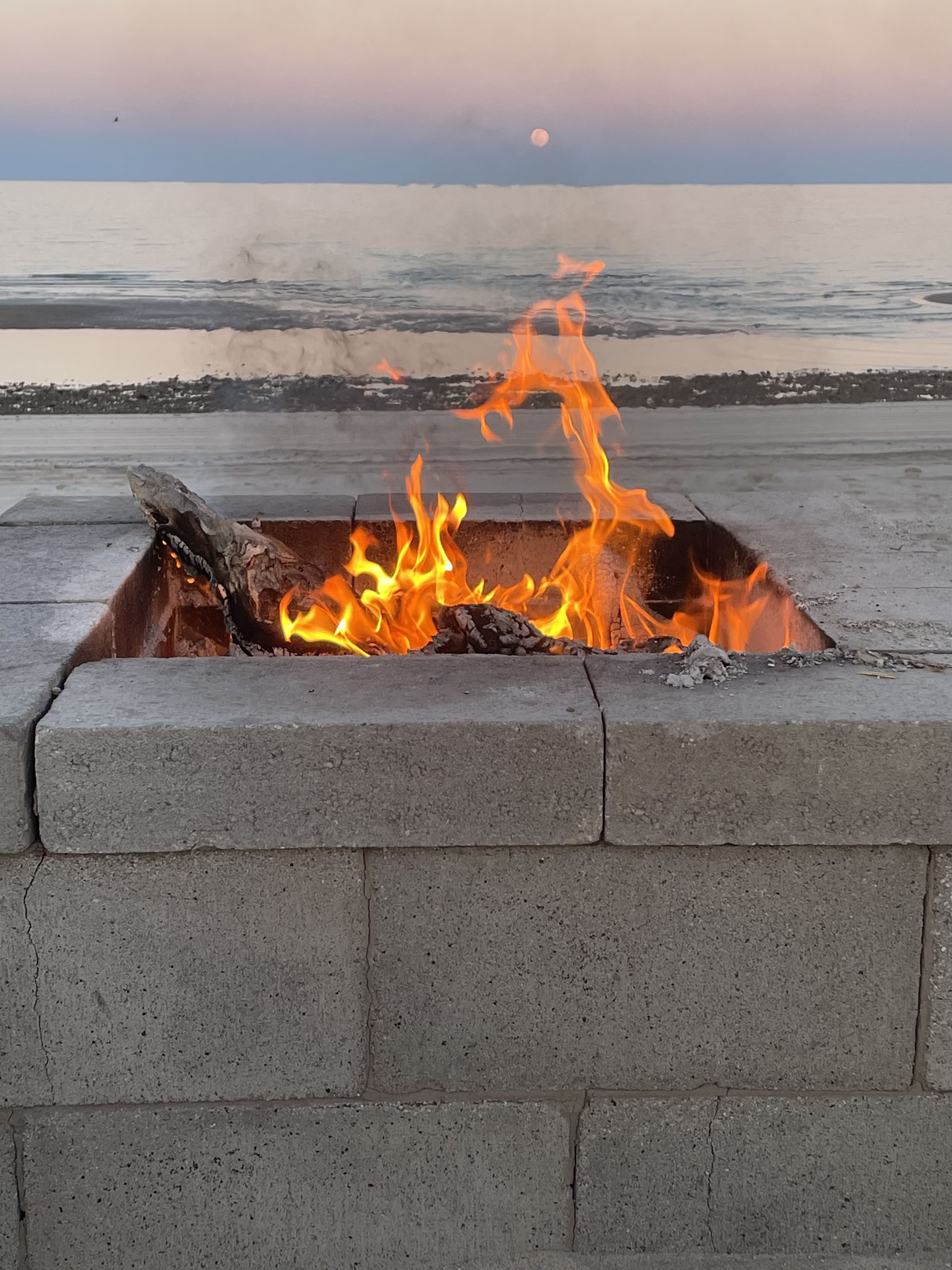 Tess and Dan celebrate the completion of the firepit with electric candles