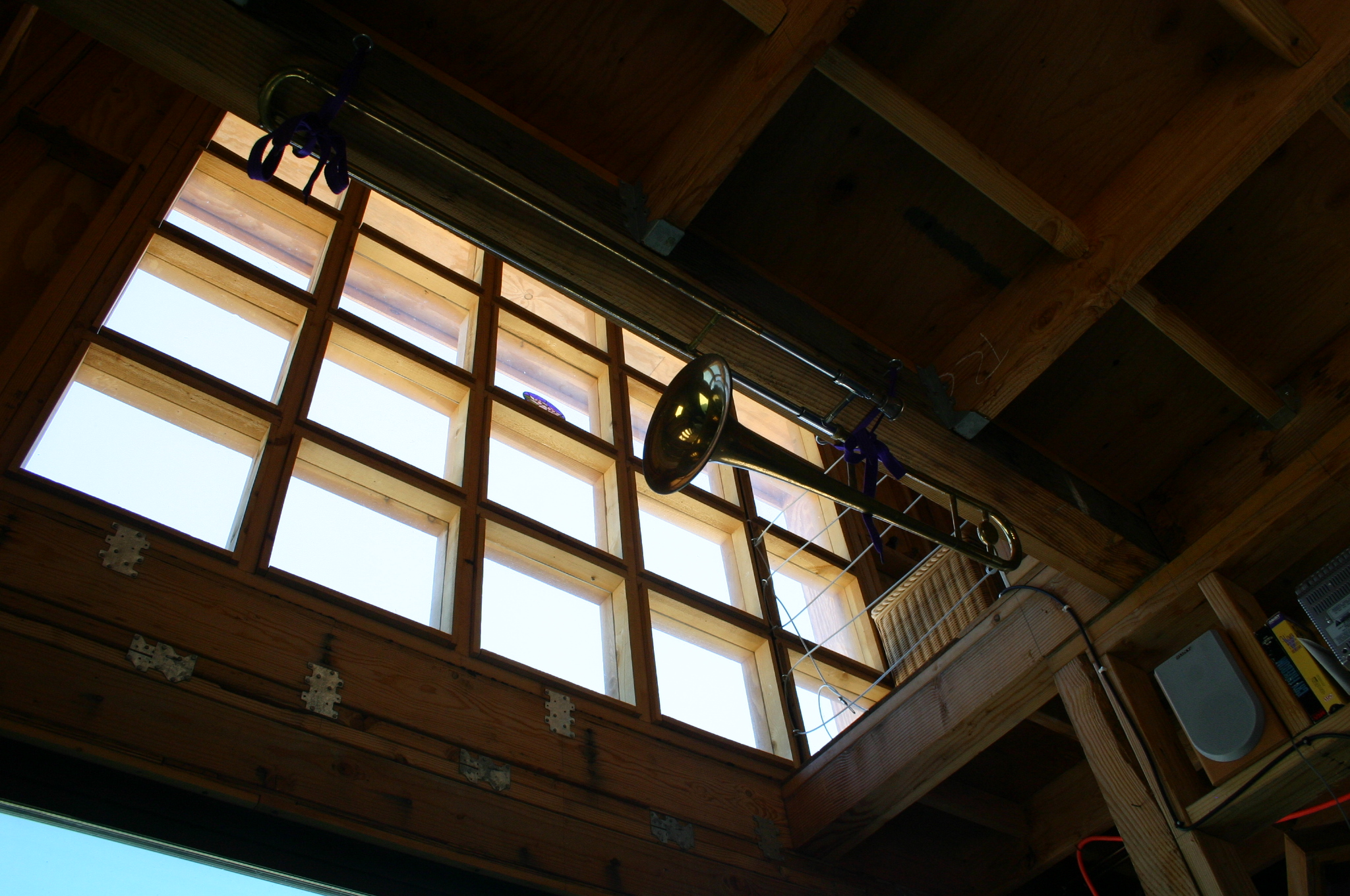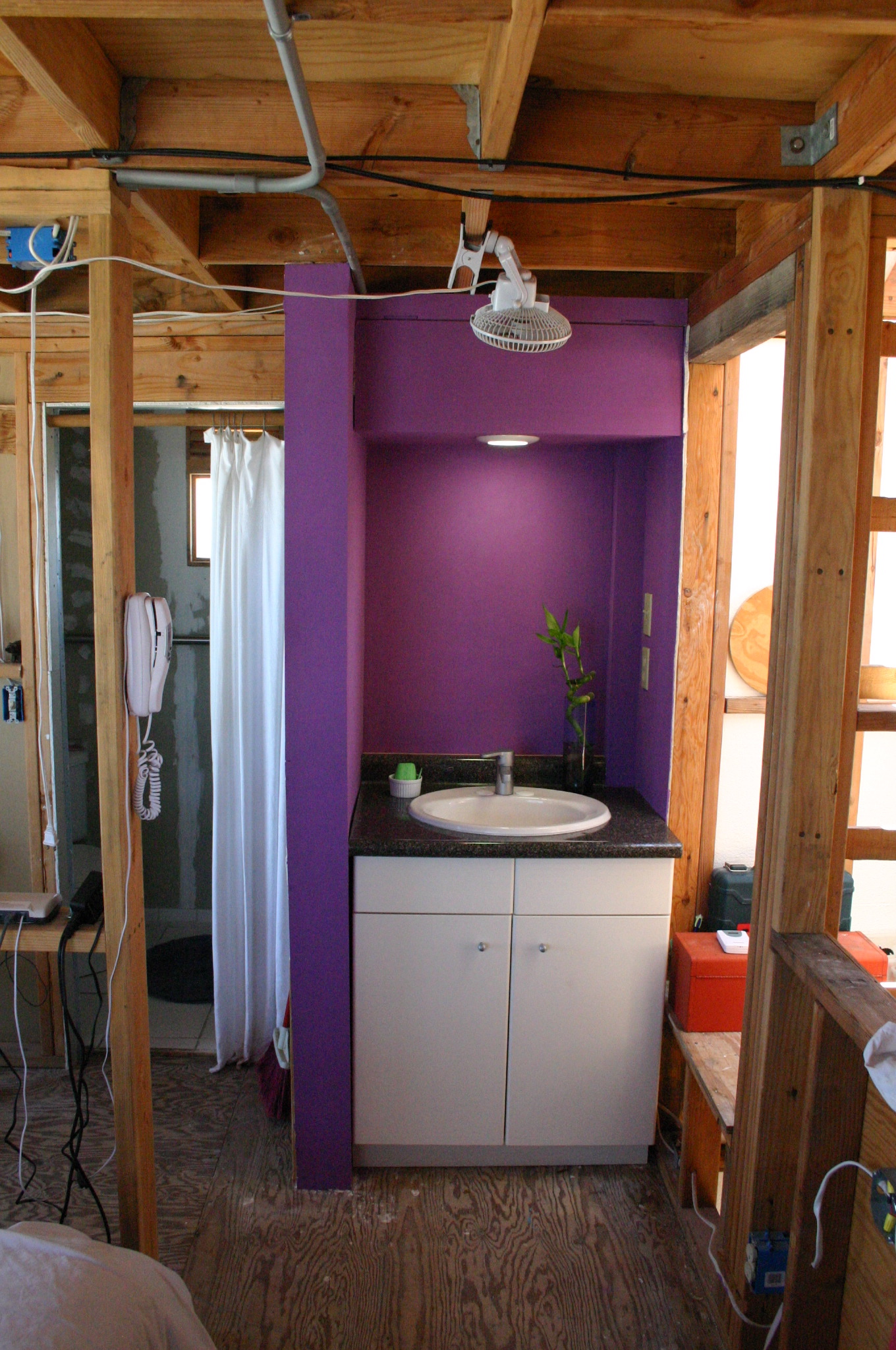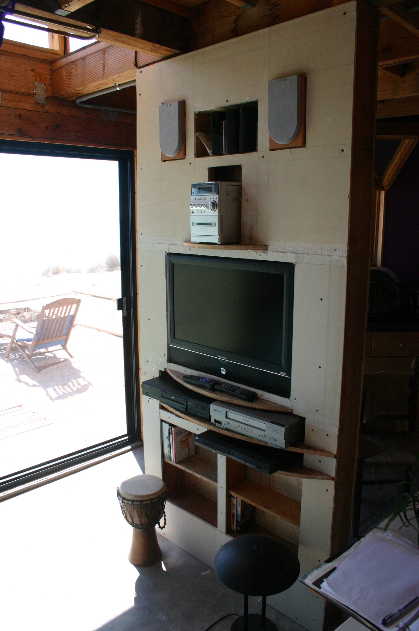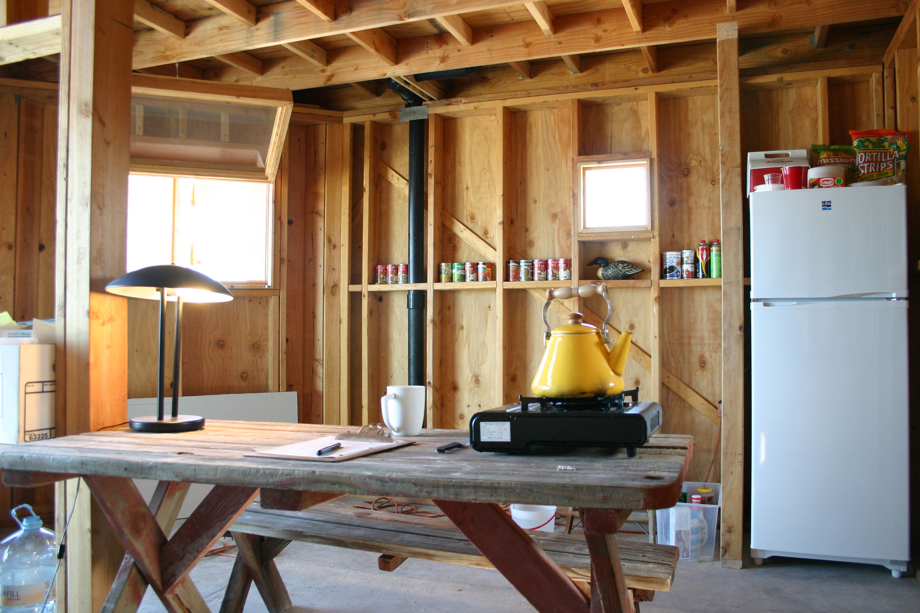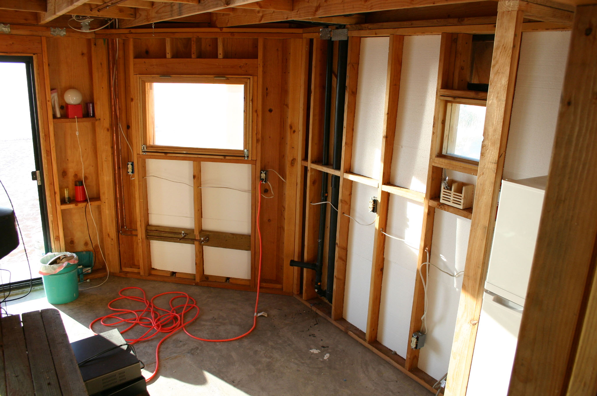 The open framing provides a convenient nook for creature comforts during construction