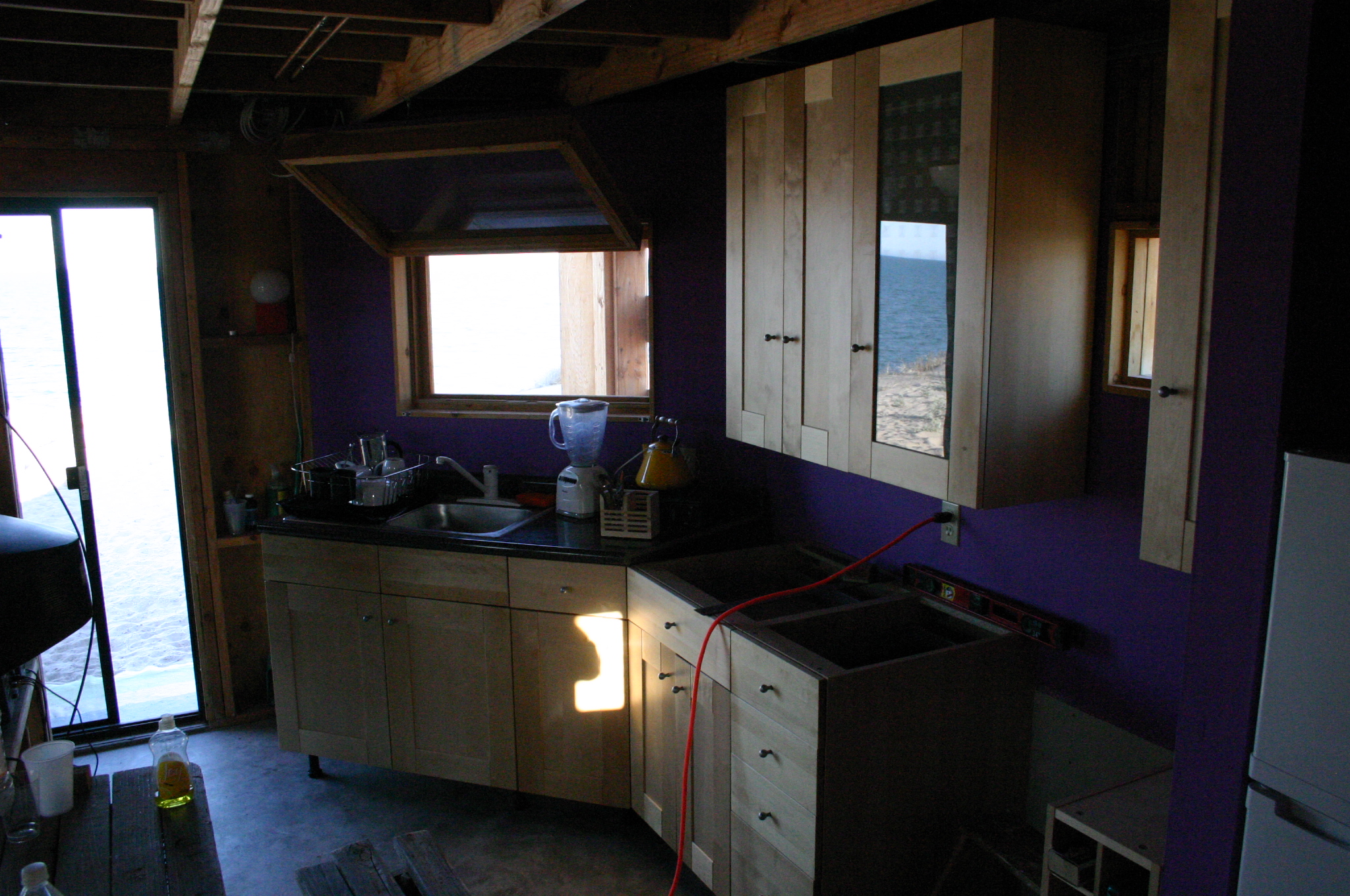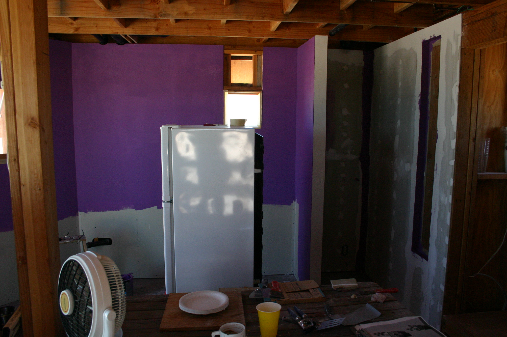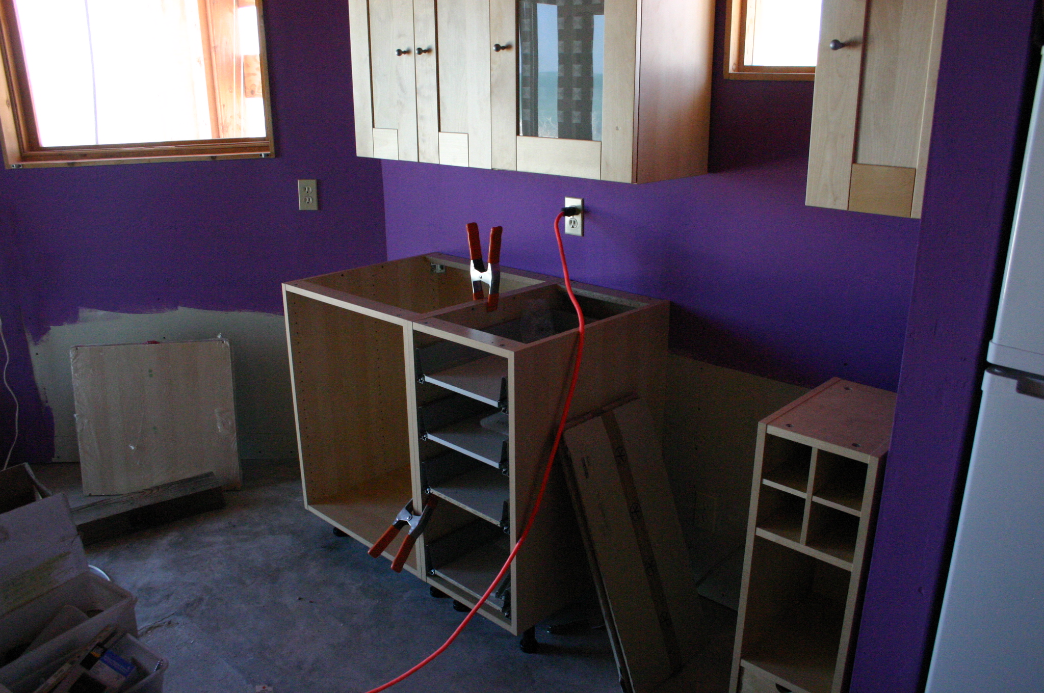 The lower walls are left unpainted since the will be covered by cabinets, meanwhile the upper cabinets are assembled and hung
