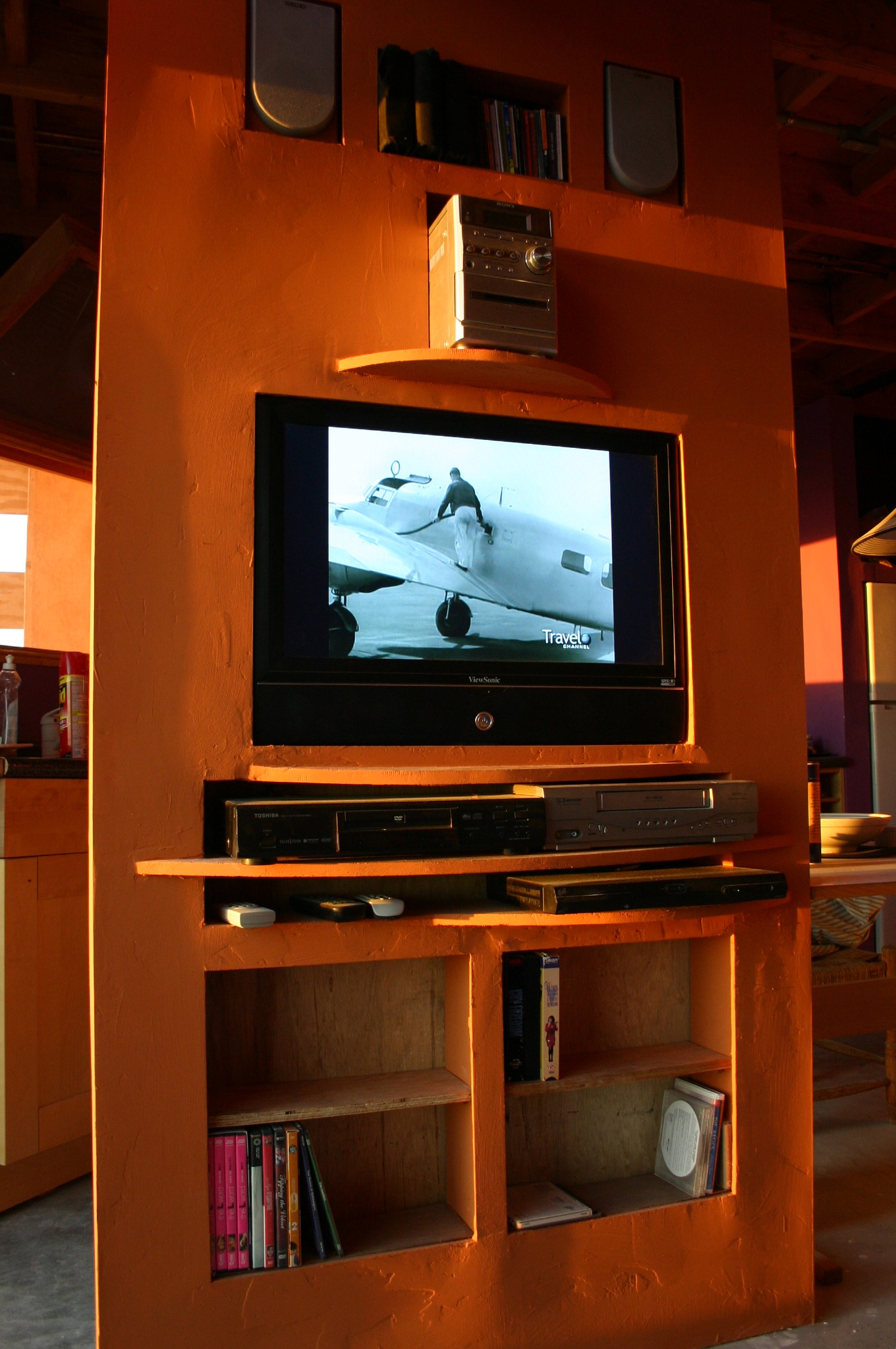 Turning the room divider—necessary to support the roof structure—but awkwardly space-confining into a useful object by housing a media center in it.
