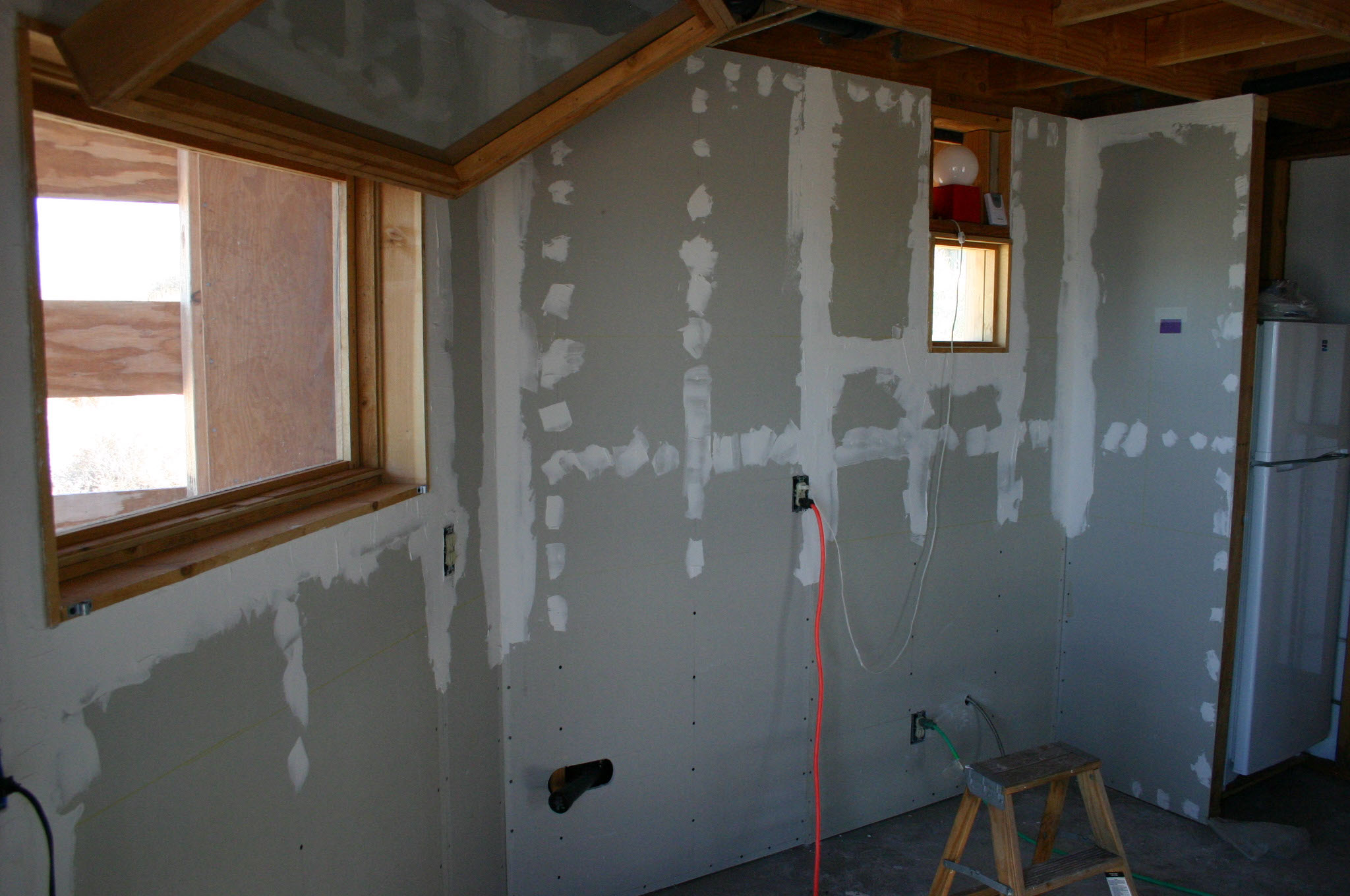 Drywall in the kitchen area now complete