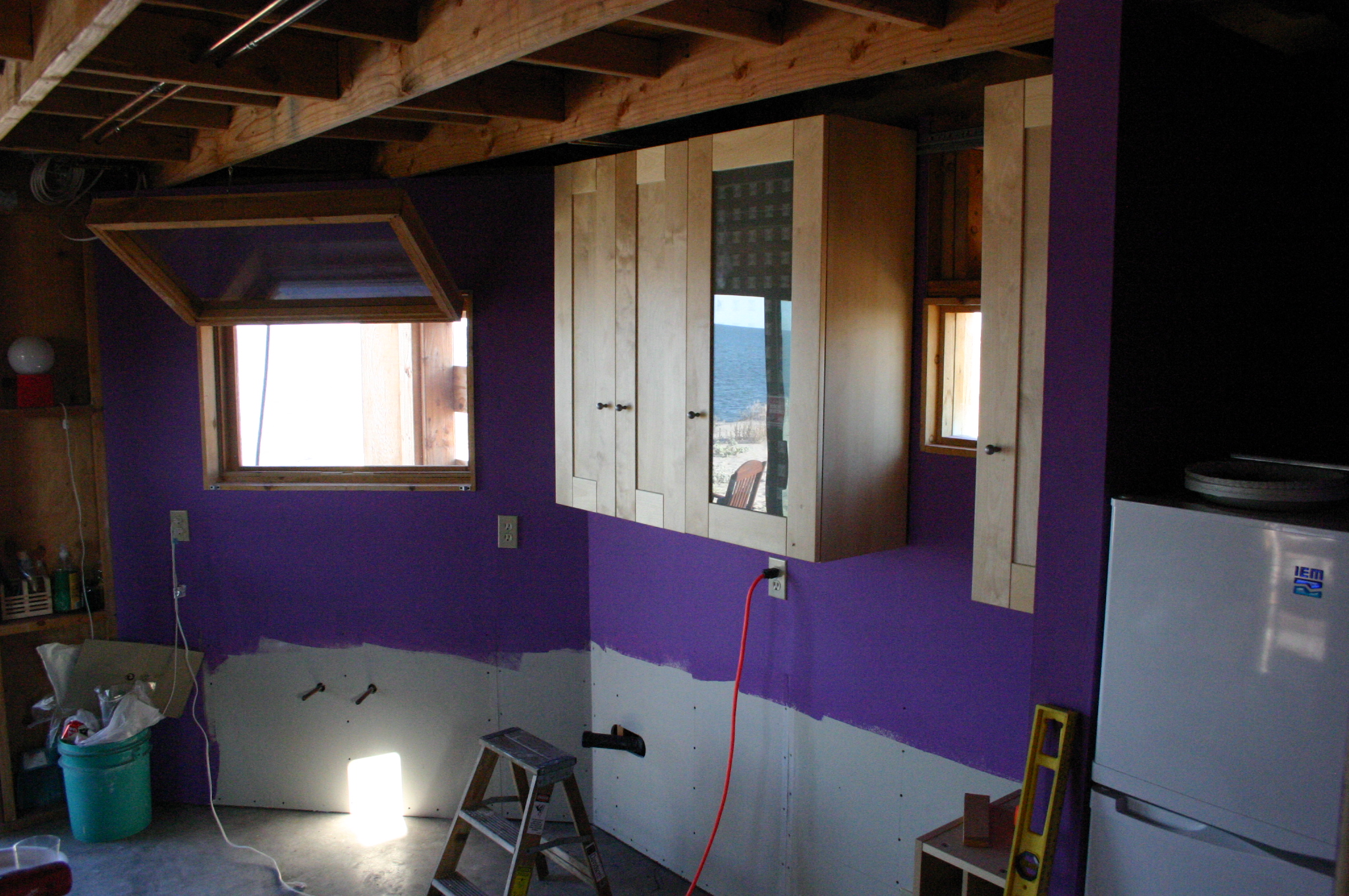 The lower walls are left unpainted since the will be covered by cabinets, meanwhile the upper cabinets are assembled and hung