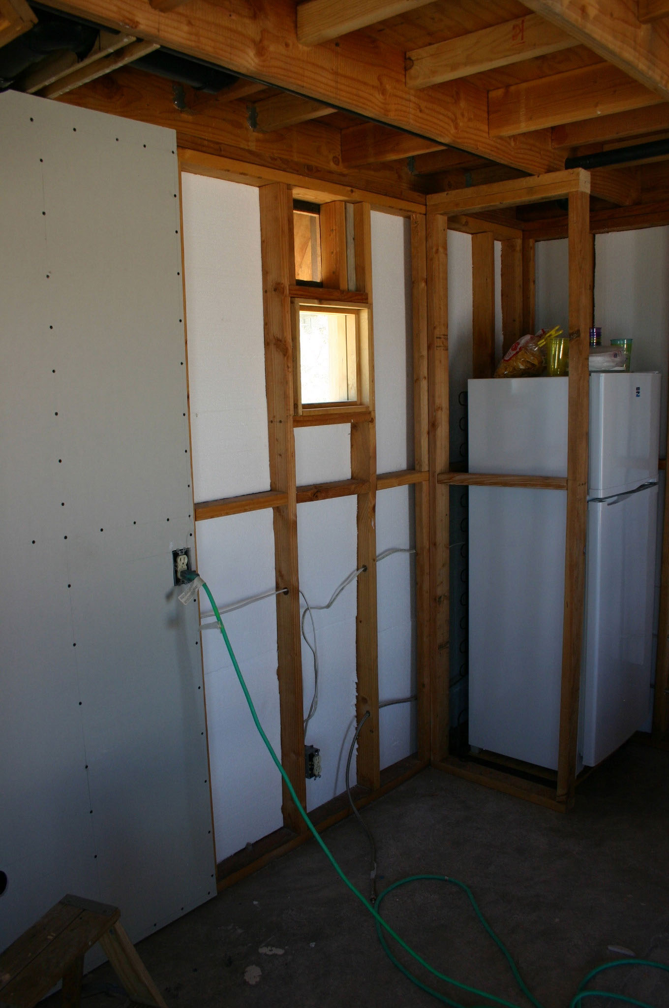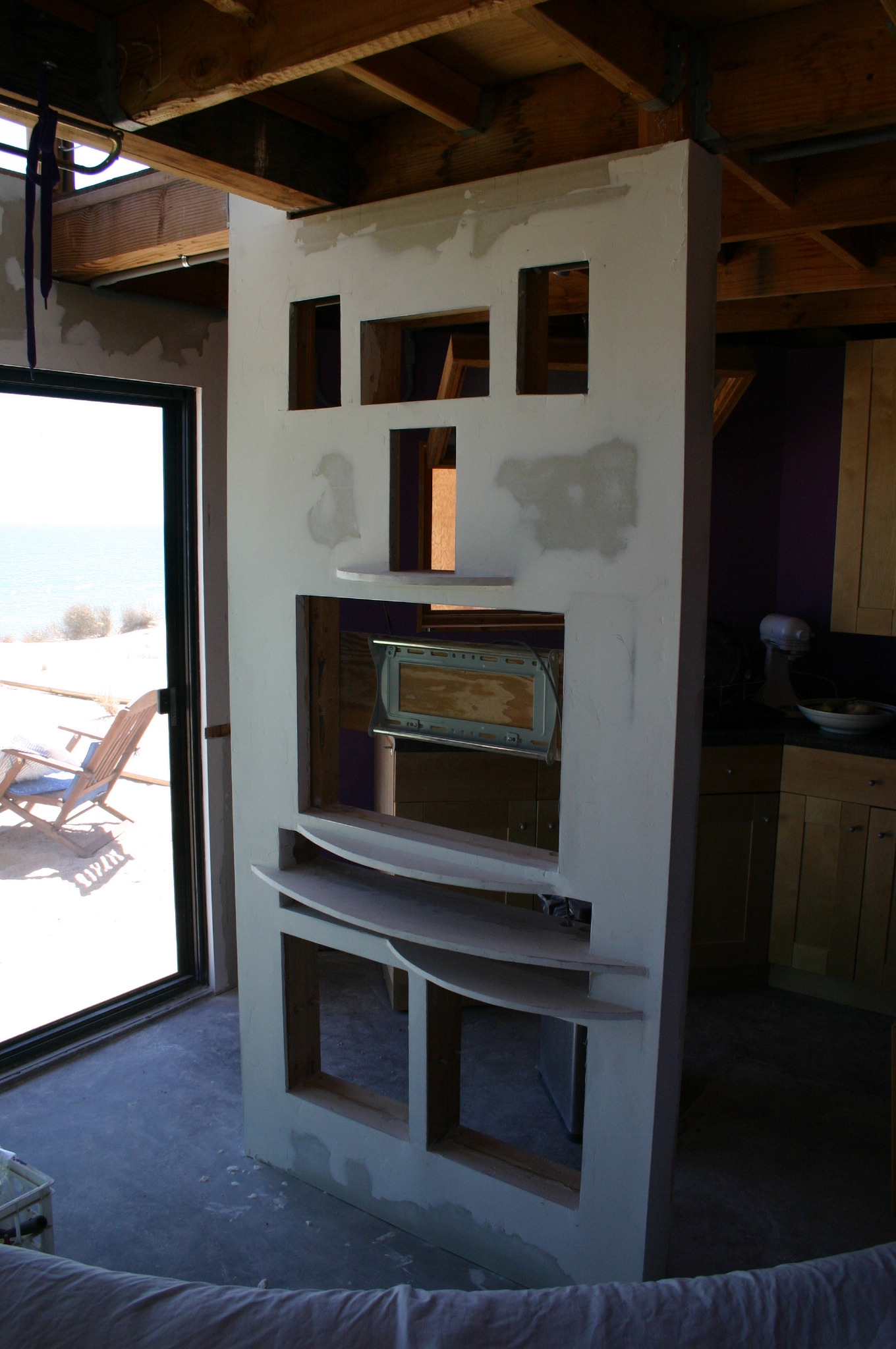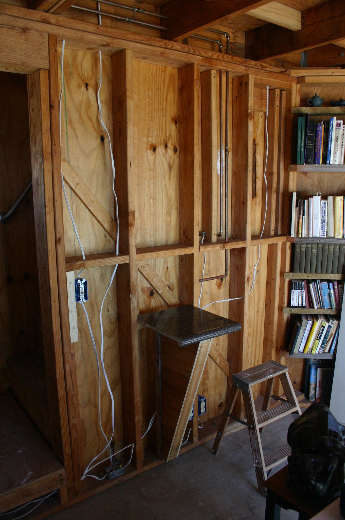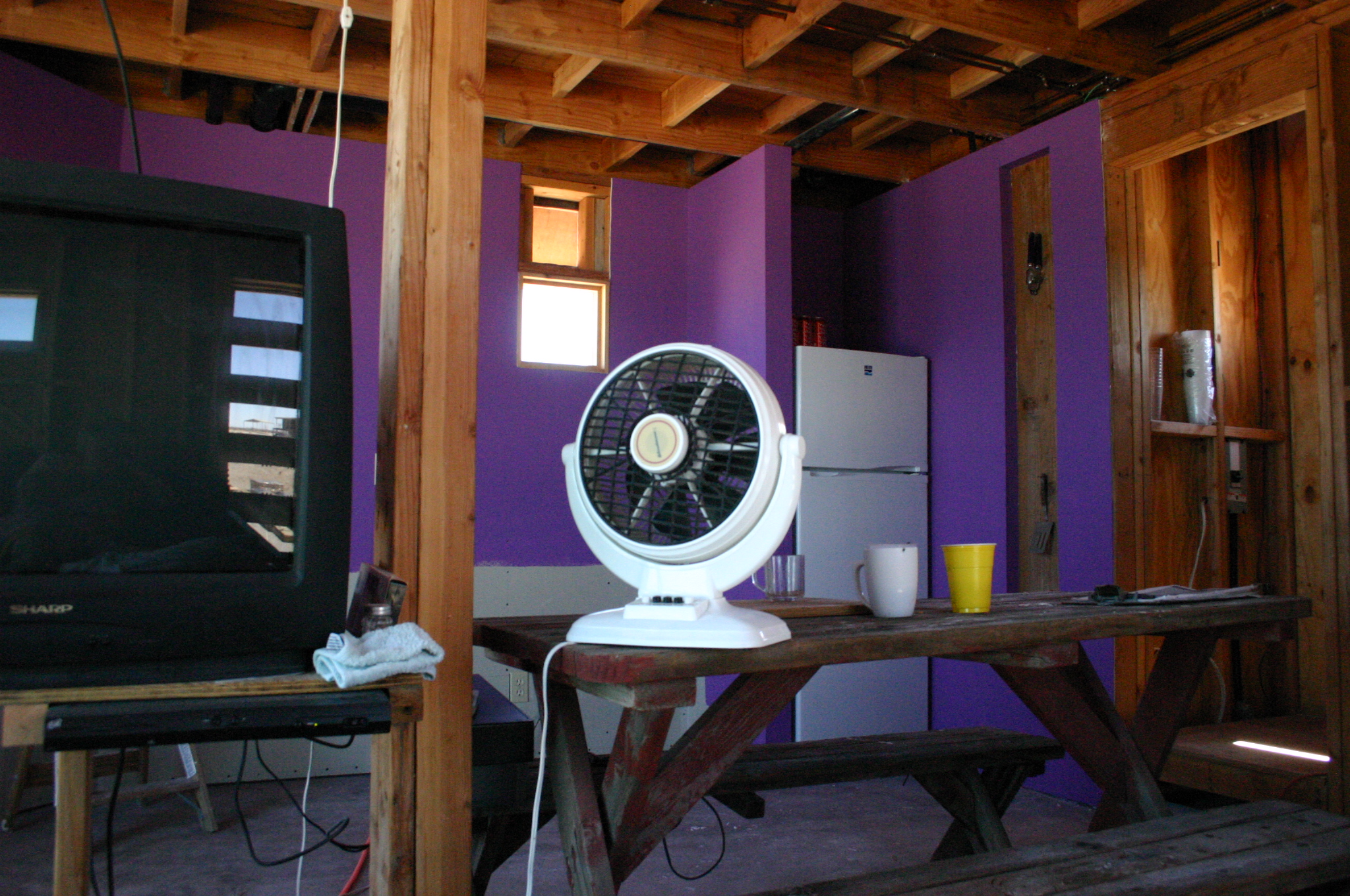 The open framing provides a convenient nook for creature comforts during construction