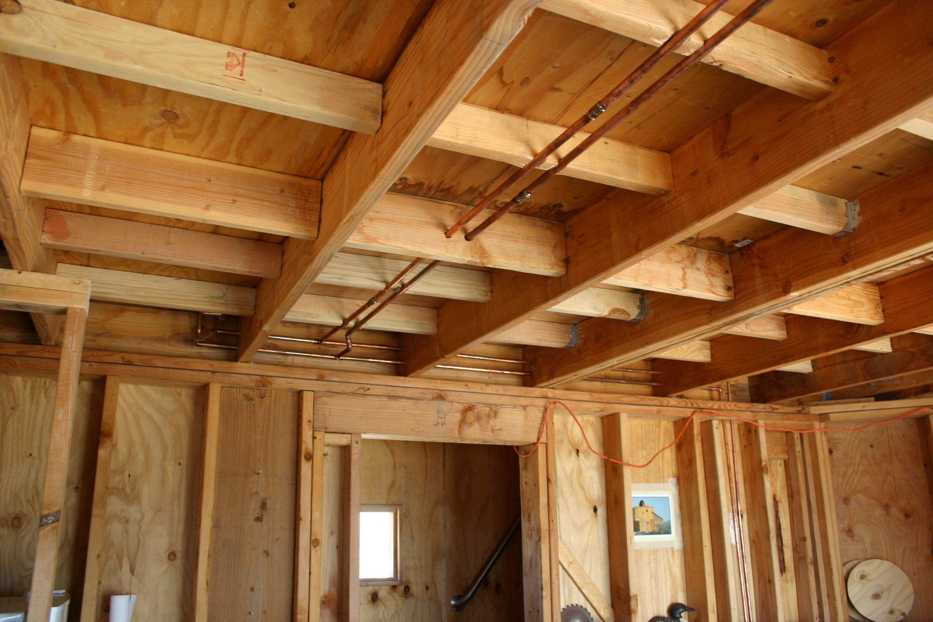 Copper pipes for hot and cold water run exposed in the ceiling