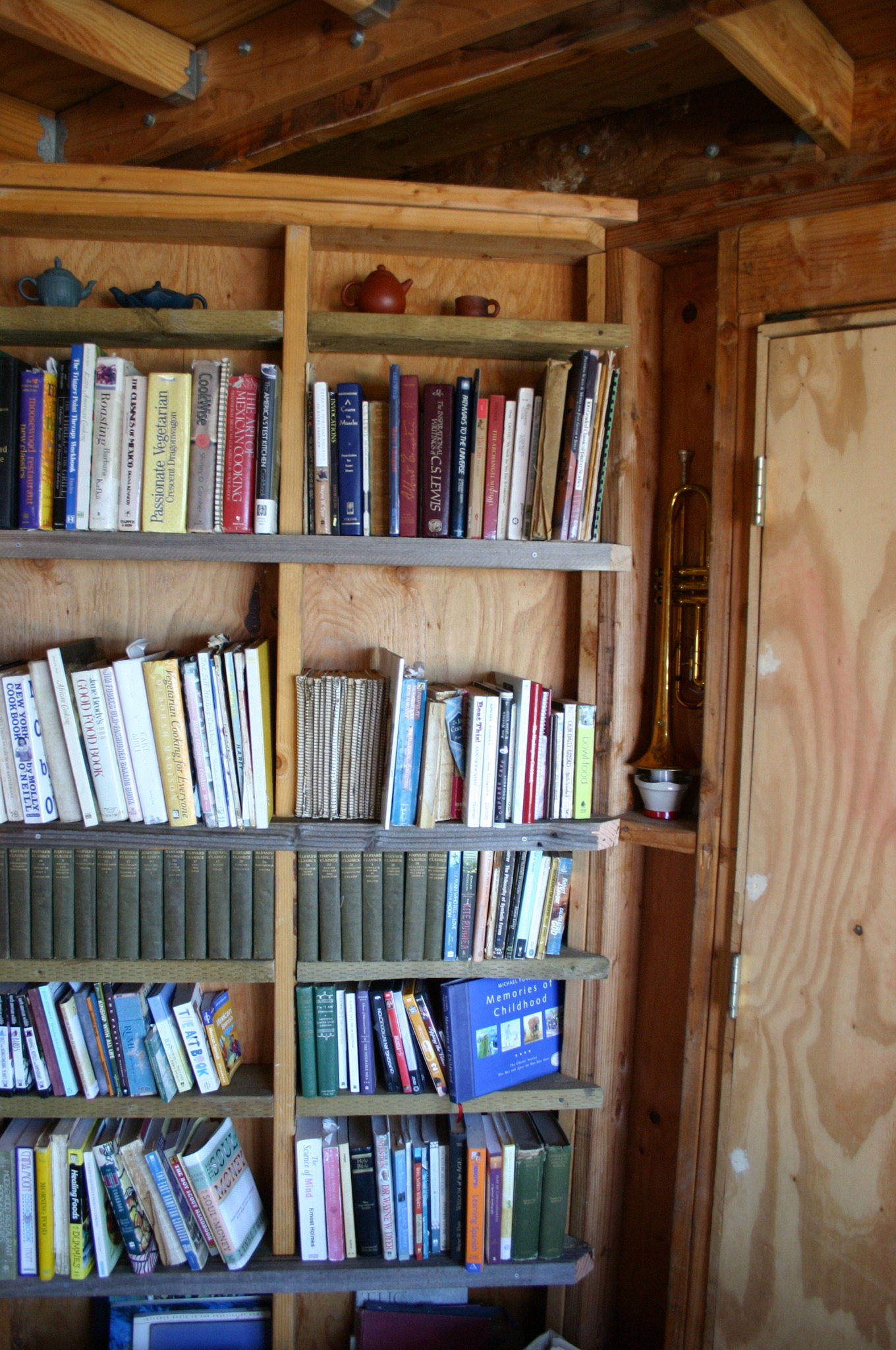 A crude bookcase made of scrap wood forms the Cube library