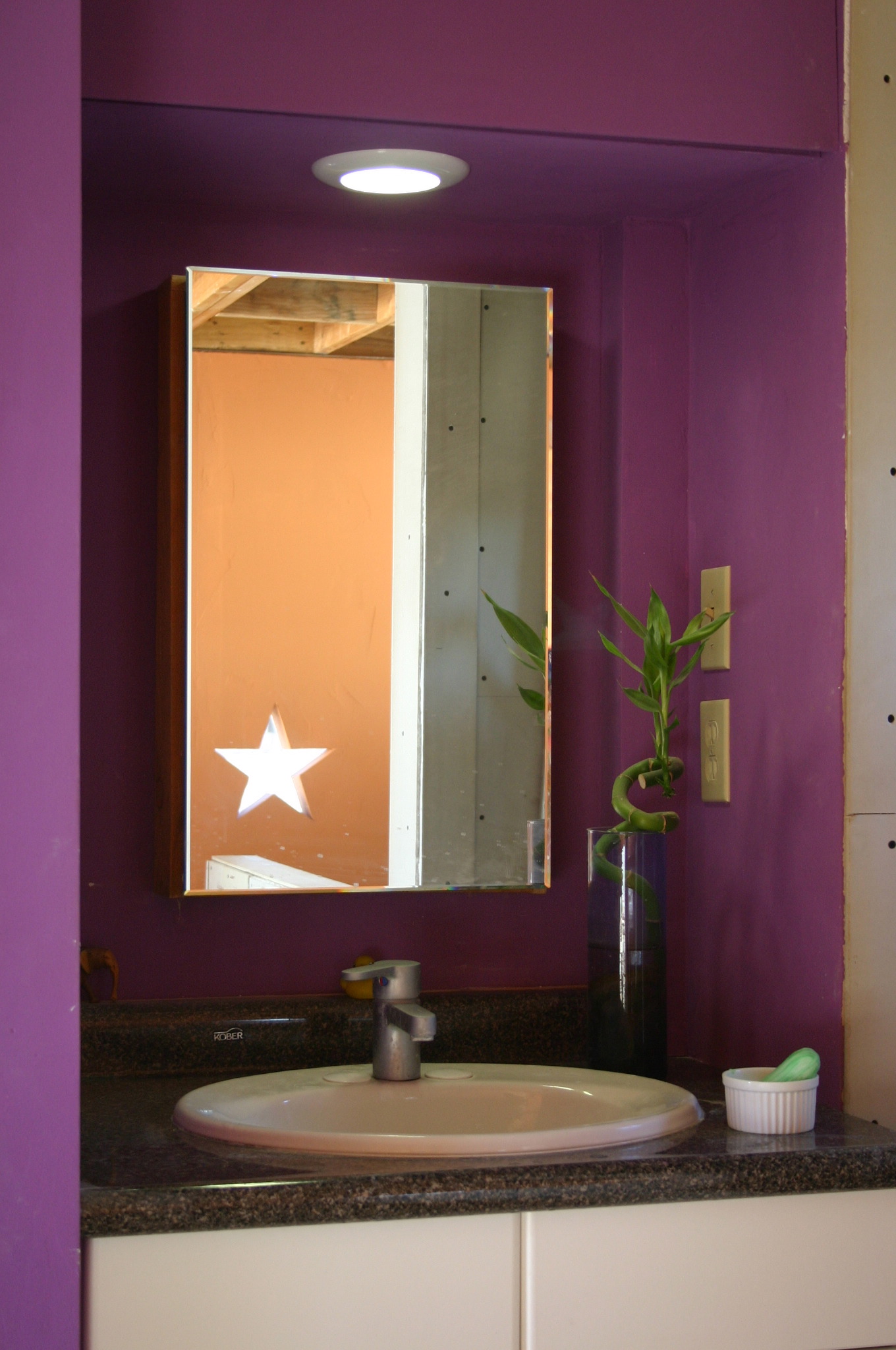 The pedestal and the wall behind it are now enclosed with drywall