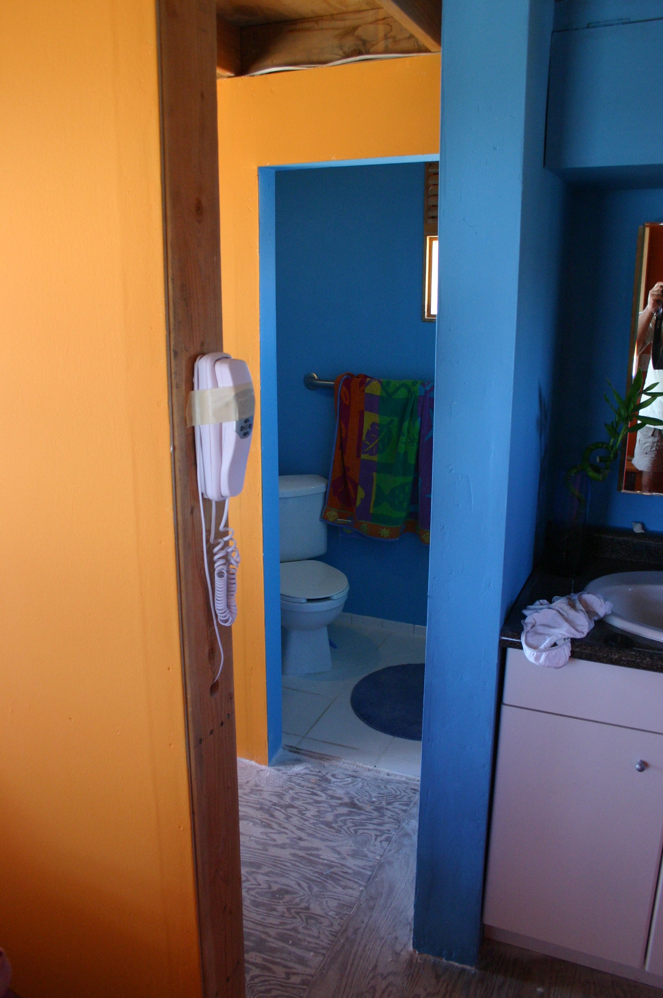 A perky paint scheme for the bathroom. The toilet is sat at 45° to save space