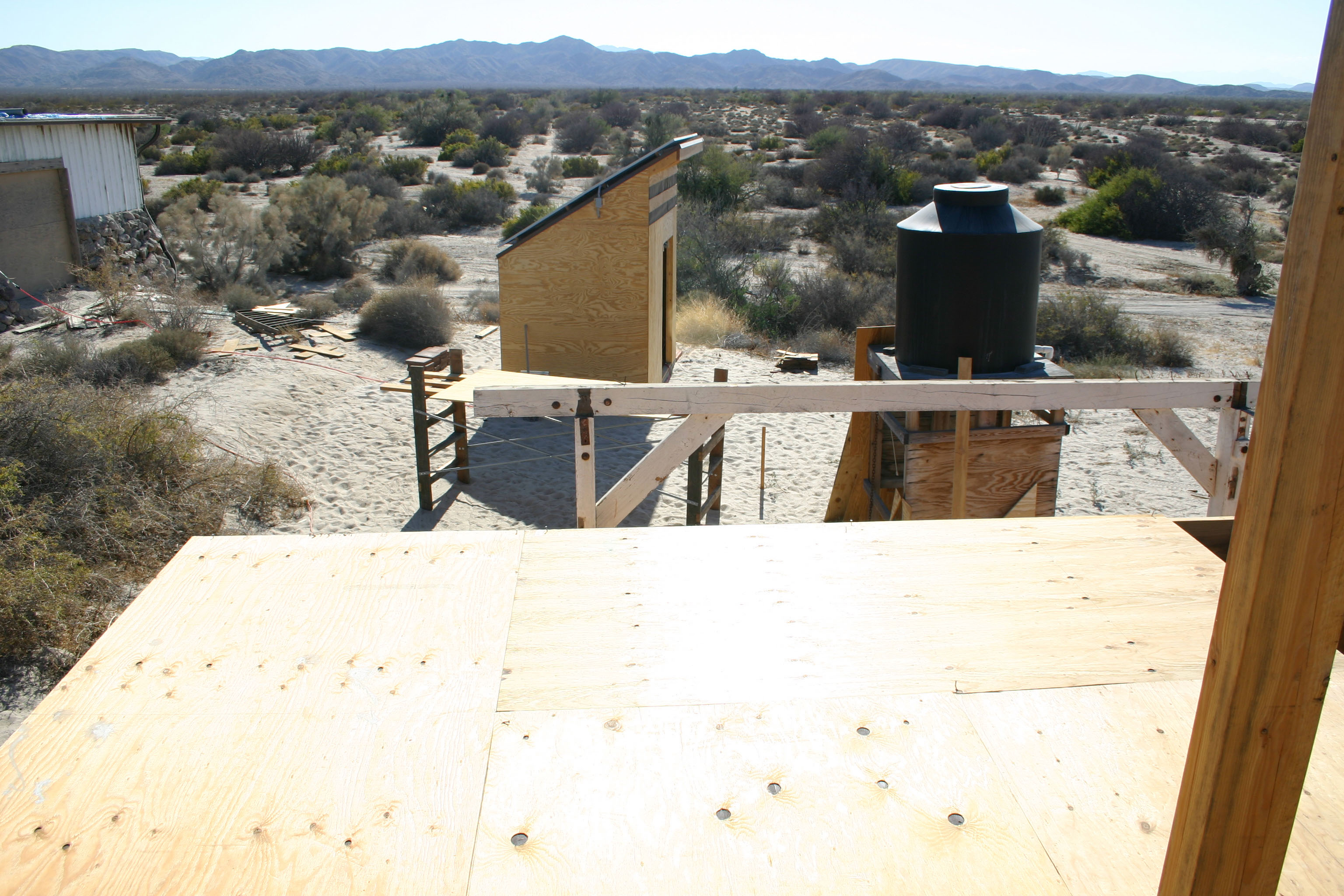 Finished shed with slats added to the insect screen vent on the North wall—view from the first floor of the incomplete Cube with the original water tank structure