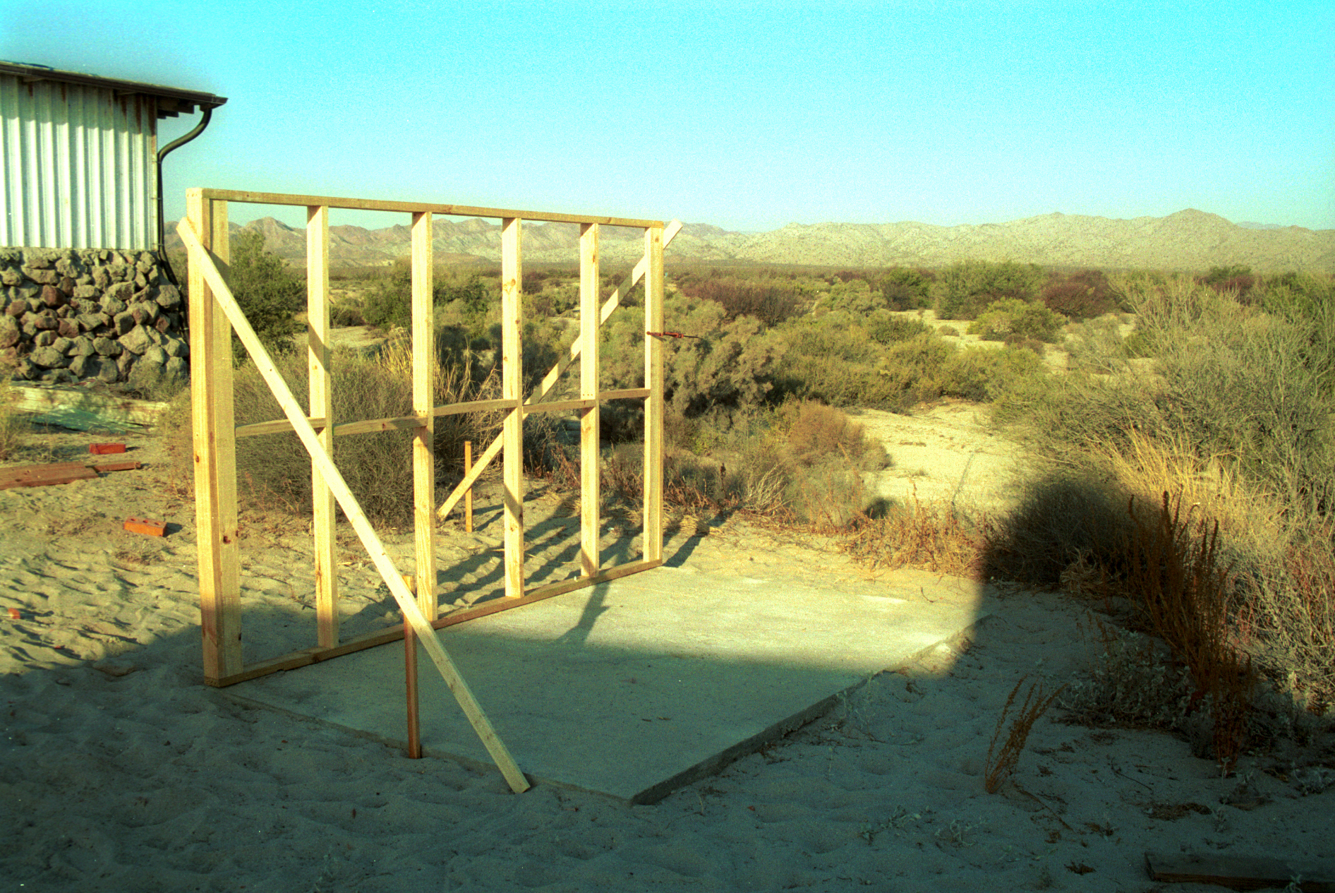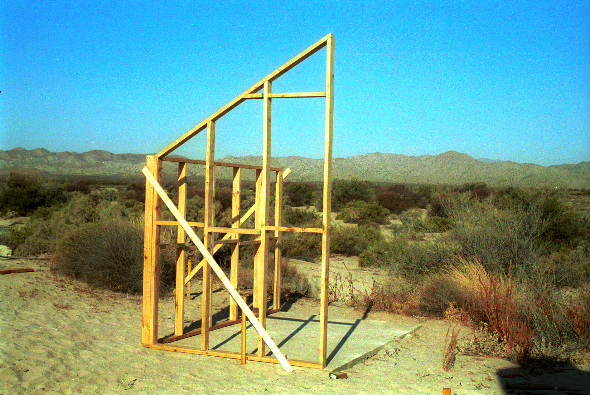 Framing the South wall. Temporary braces hold the structiure upright