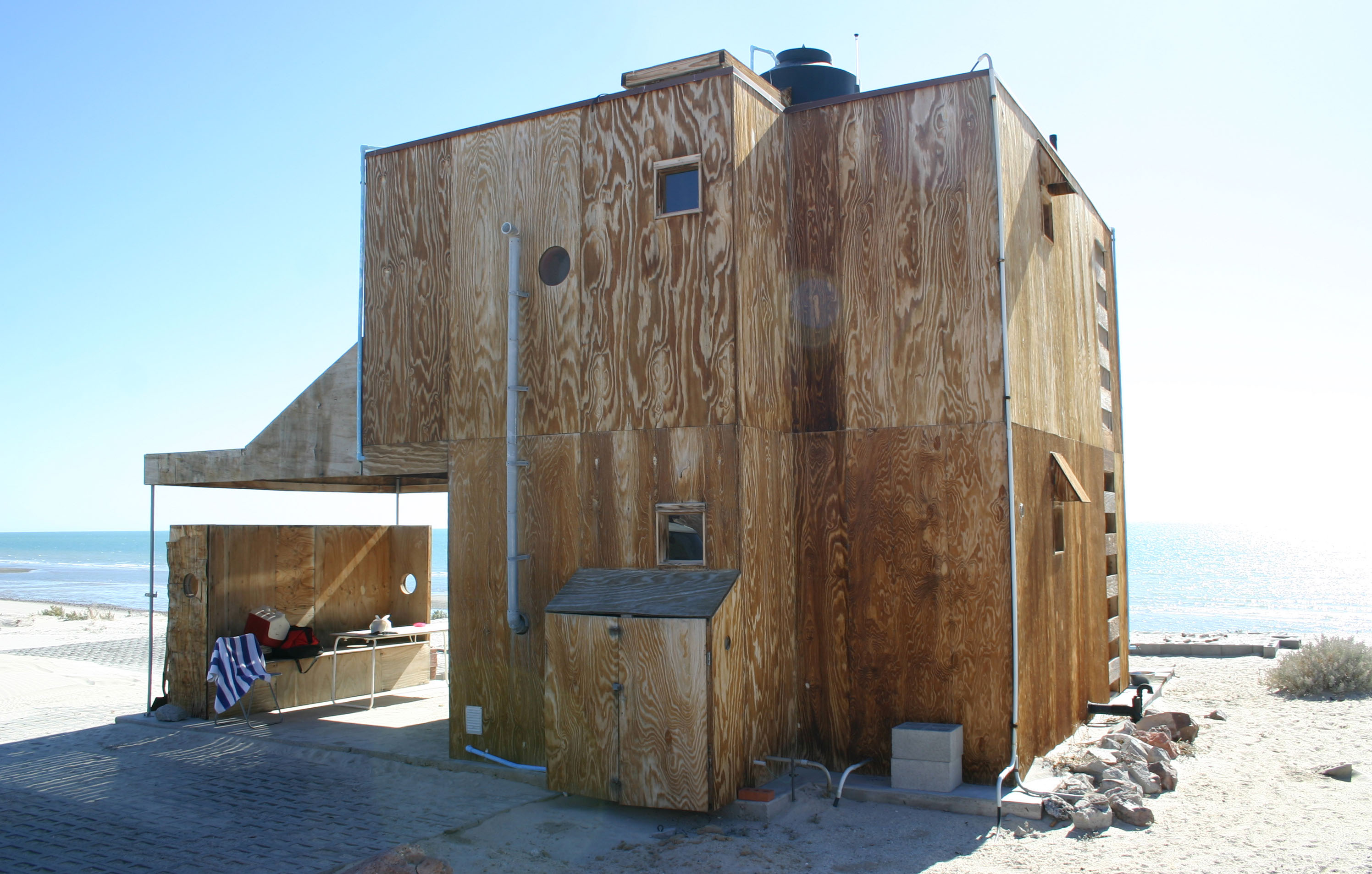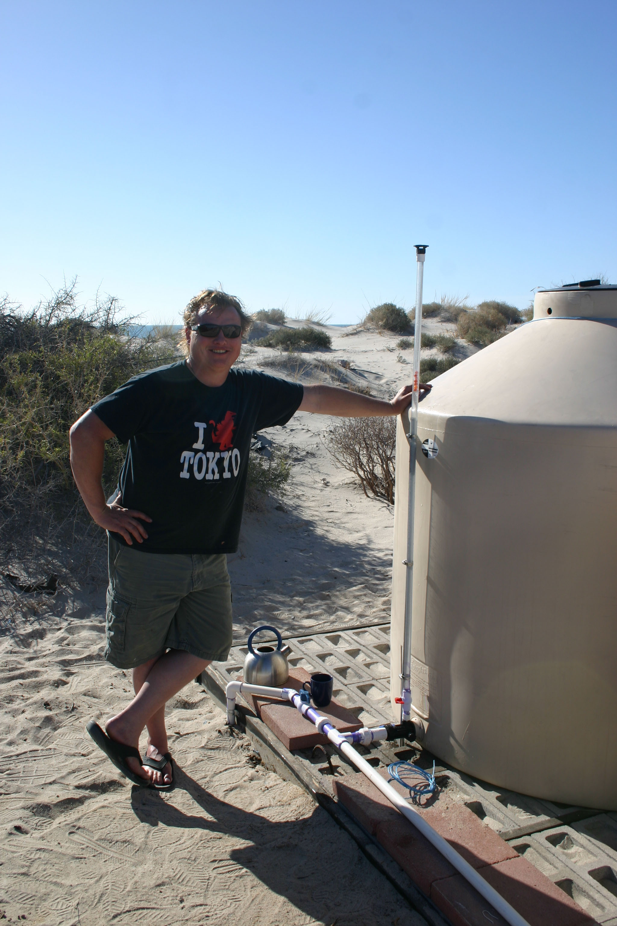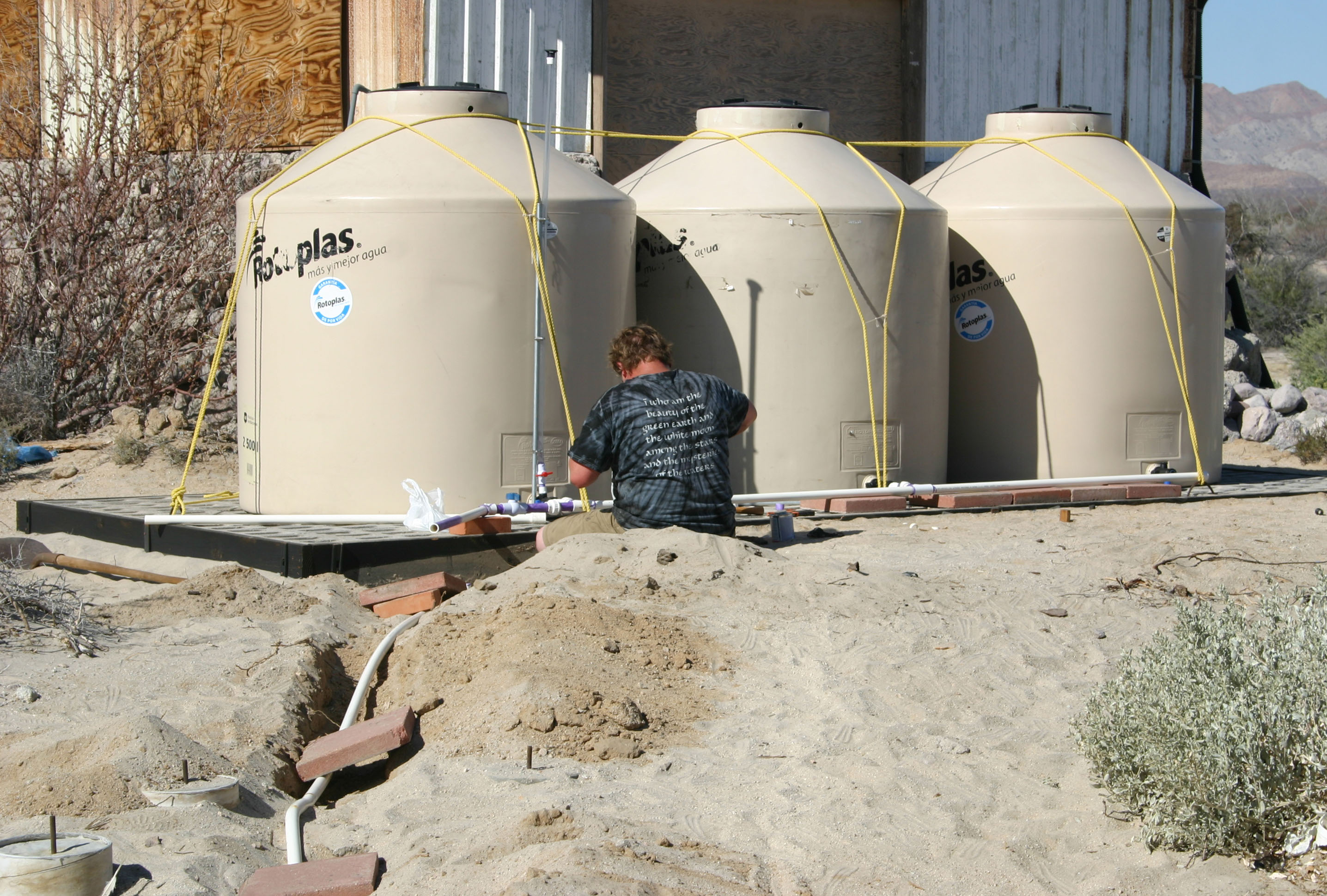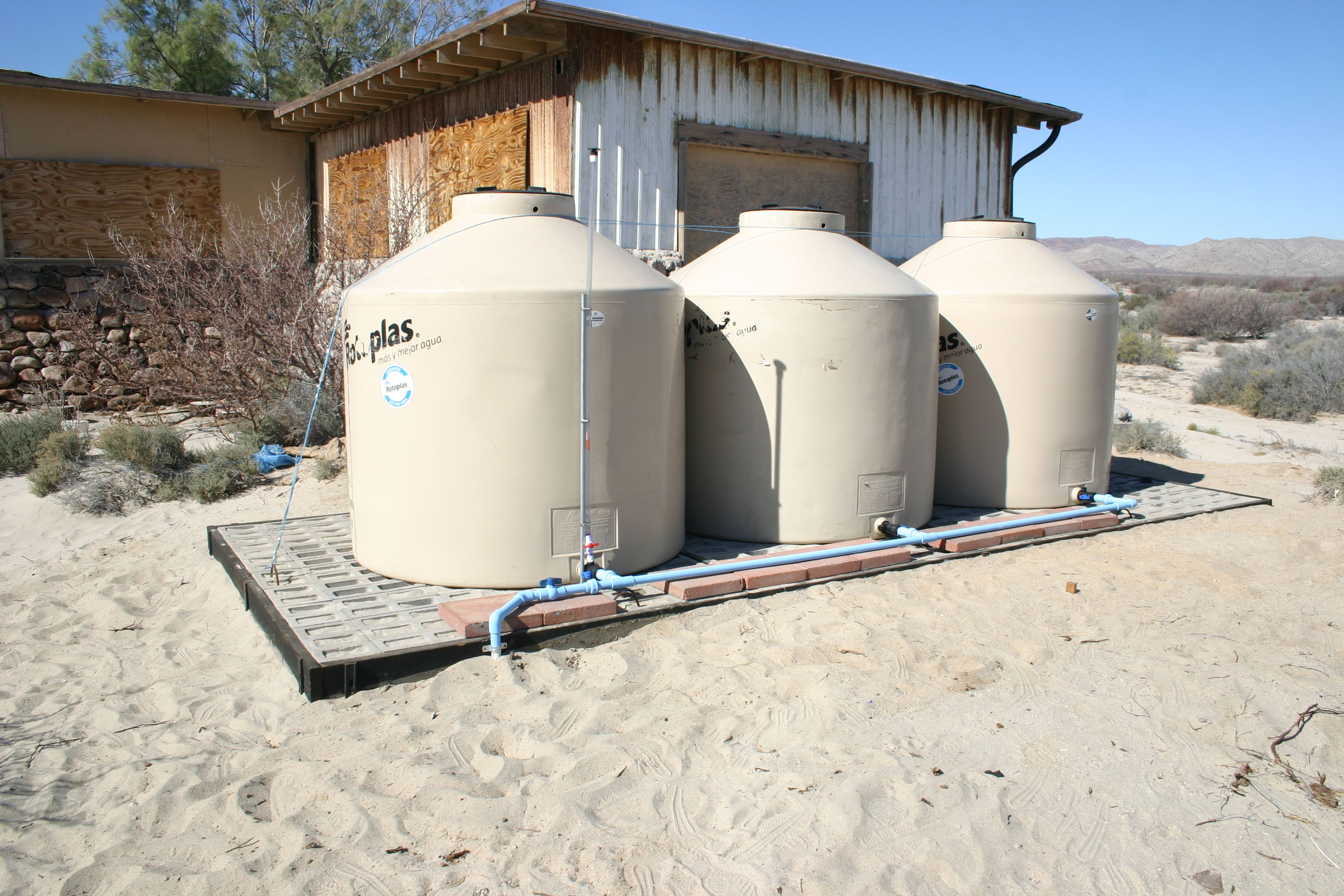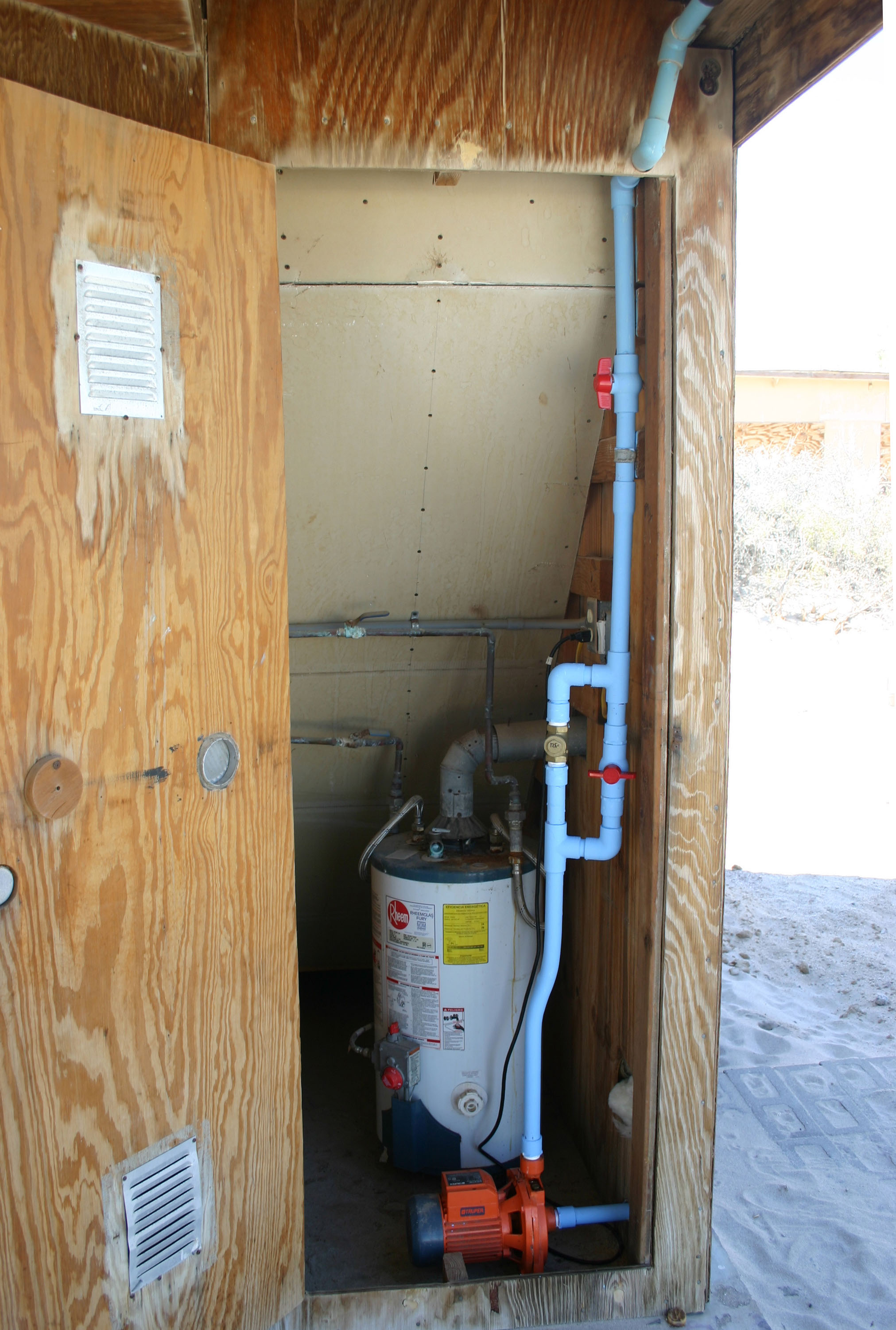 The water supply from the tank farm enters the Cube via the blue pipe under the corner of the propane hutch