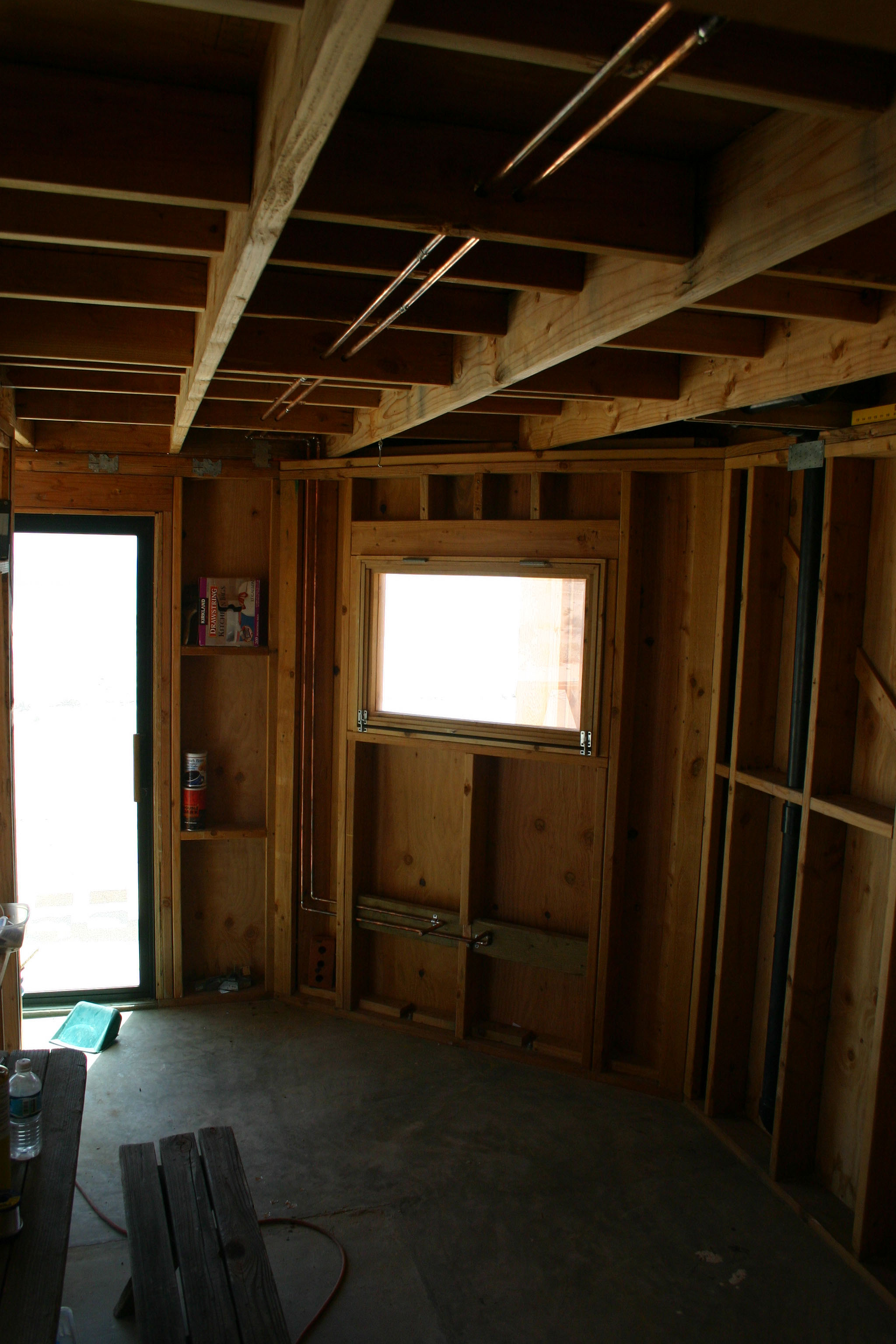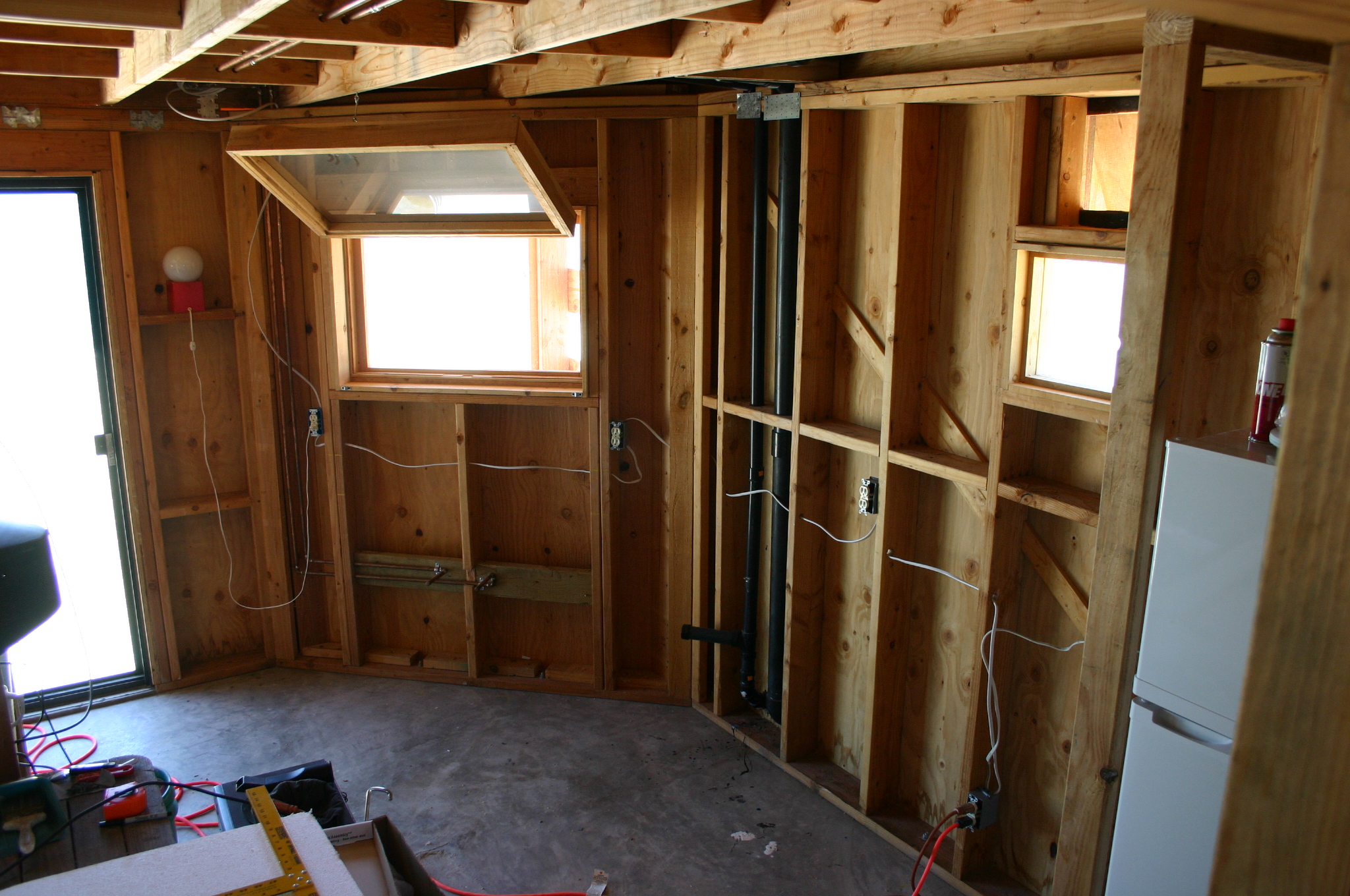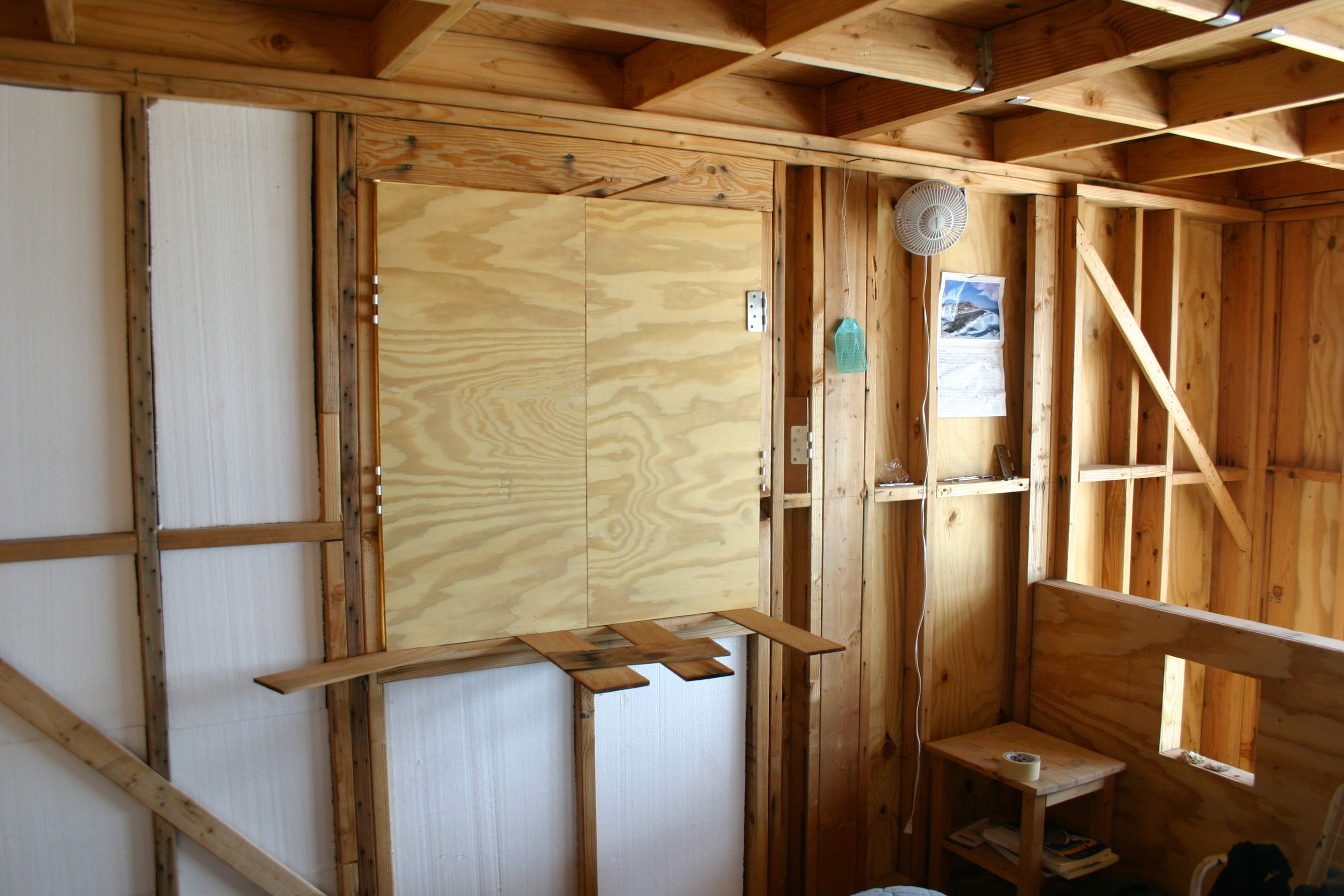 Surrounded by styrofoam insulation. The window is now secured by nailing from the exterior plywood panel. The cutout shape perched above the opening was used as a template to cut the exterior panel